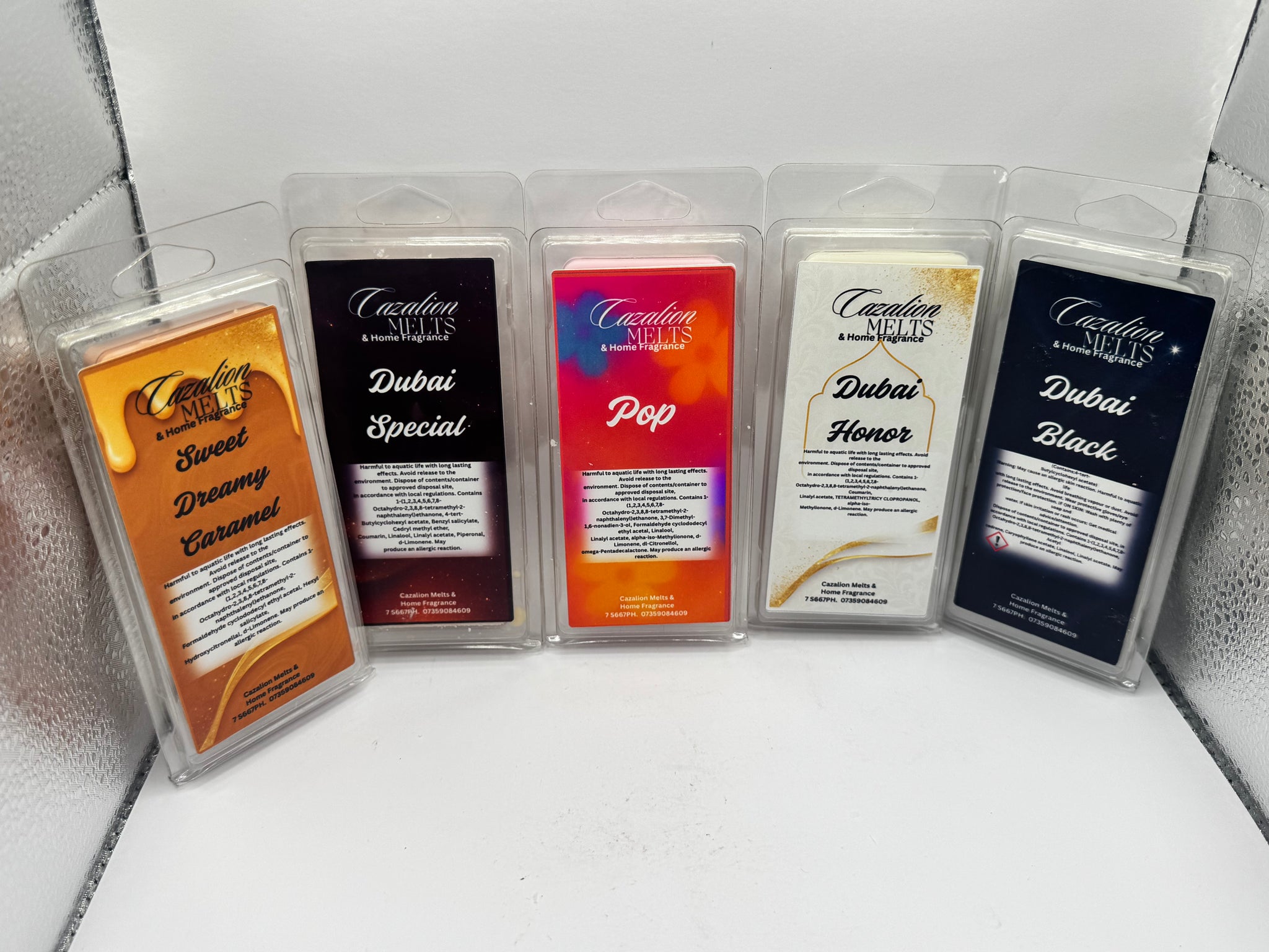 Discover the glamour of fragrance with our exclusive monthly wax melt box. This month’s collection features five stunning snap bars inspired by luxury perfumes and indulgent blends: Dubai Honor, Sweet Dreamy Caramel, Dubai Special, POP, and Dubai Black. Each highly scented wax melt is handcrafted with care, filling your home with long-lasting, irresistible aromas.