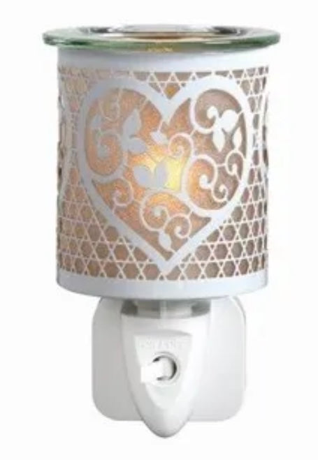 Add a touch of elegance to any room with this beautifully designed white plug-in wax melt burner. Featuring a delicate heart pattern with a soft, shimmering background, this burner creates a warm, cosy glow when switched on.